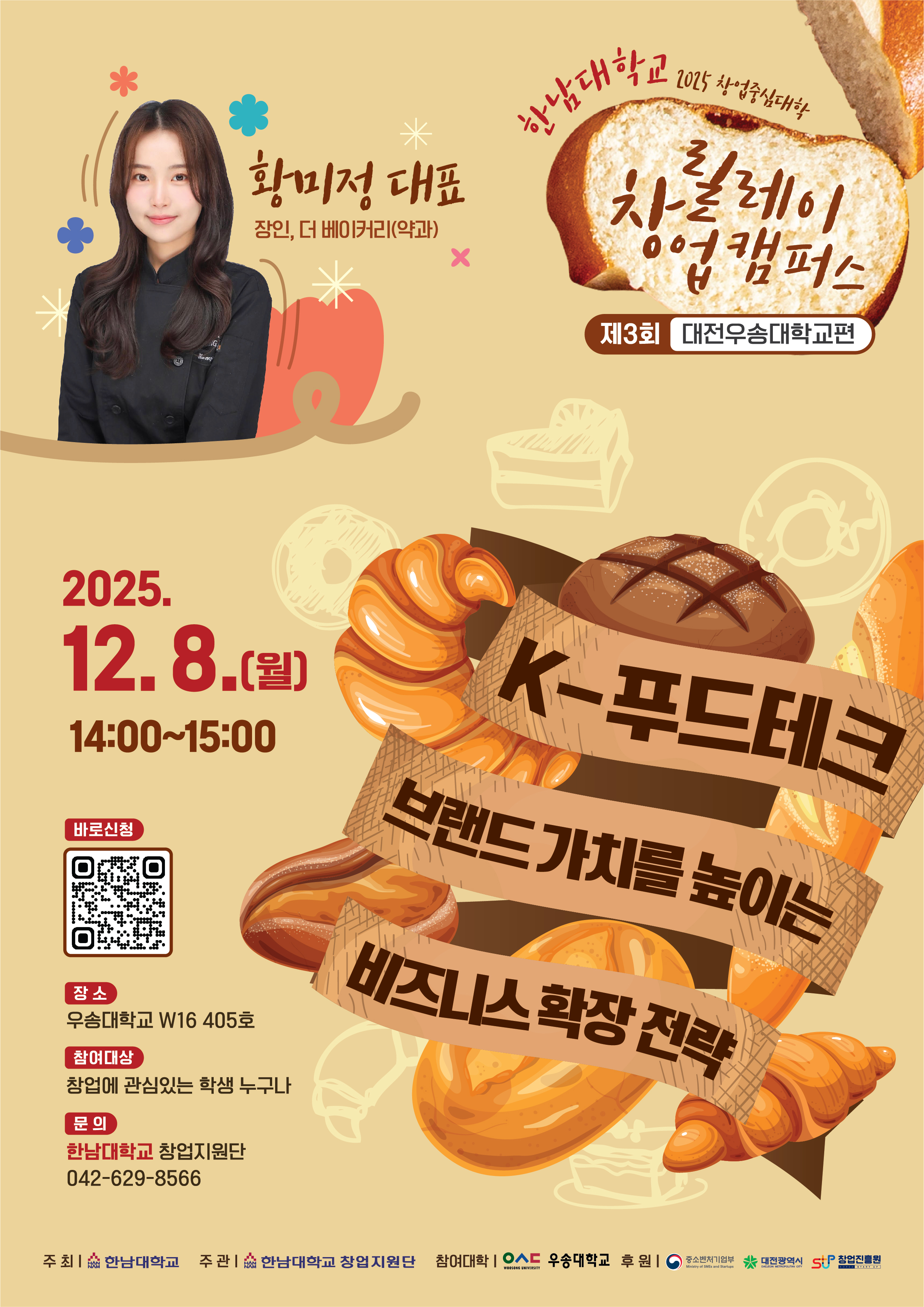 정보마당 공지사항 창업소식 자료실 갤러리 Home정보마당공지사항 공지사항 [한남대학교 창업중심대학] 2025 릴레이 창업 캠퍼스 3차 특강 안내 작성자 : 관리자 | 작성일 : 2025.12.02 | 조회수 : 40 한남대학교와 우송대학교가 함께 준비한 브랜드 비즈니스 확장 전략 특강에 창업에 관심 있는 대학생 및 청년(예비창업자) 여러분을 초대합니다! 관심 있는 분들의 많은 참여 바랍니다. 가. 일시: 2025. 12. 8.(월) / 14:00~15:00 나. 장소: 우송대학교 W16 405호 다. 대상: 창업에 관심 있는 권역 내 대학생 및 청년 누구나 라. 강사: 장인,더 베이커리(장인, 더 약과) 황미정 대표 마. 주제: '장인, 더'창업-브랜드 가치를 높이는비즈니스 확장 전략(가제) 바. 주체/주관: 한남대학교, 우송대학교 사. 신청링크: https://forms.gle/XfXkjhNZ3eJ9zMw48 기타문의: 창업자원종합관리센터 (042-630-9150) 붙임: 2025 릴레이 창업 캠퍼스(우송대학교) 포스터 1부. 끝. 첨부파일 [2]2025 릴레이 창업 캠퍼스(우송대학교) 포스터.jpg 목록