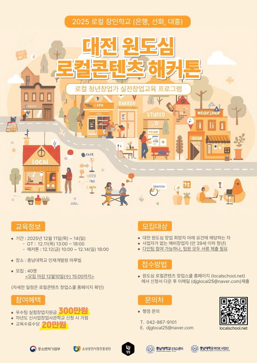 글로컬·로컬브랜드 상권 내 로컬 콘텐츠 기반의 창업아이템 발굴 및 구체화를 지원하는「2025년 로컬 장인학교(2025년 대전 원도심 해커톤)」 에 참여할 예비창업 교육생을 다음과 같이 모집합니다.