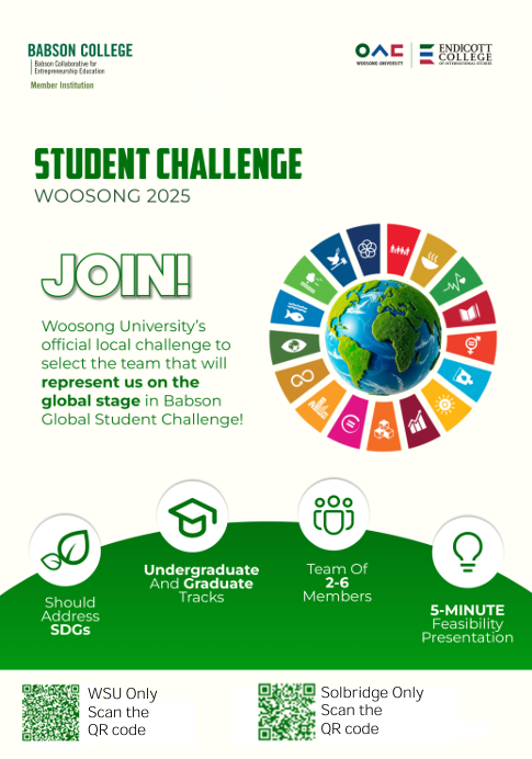 우송대학교 창업자원종합관리센터에서는 창의인재 발굴 및 창업문화 확산, 예비창업자들을 대상으로 아이디어를 검증 받을 수 있는 기회를 제공하기 위해 [2025 Student Challenge 창업아이디어 경진대회}를 다음과 같이 공고합니다.