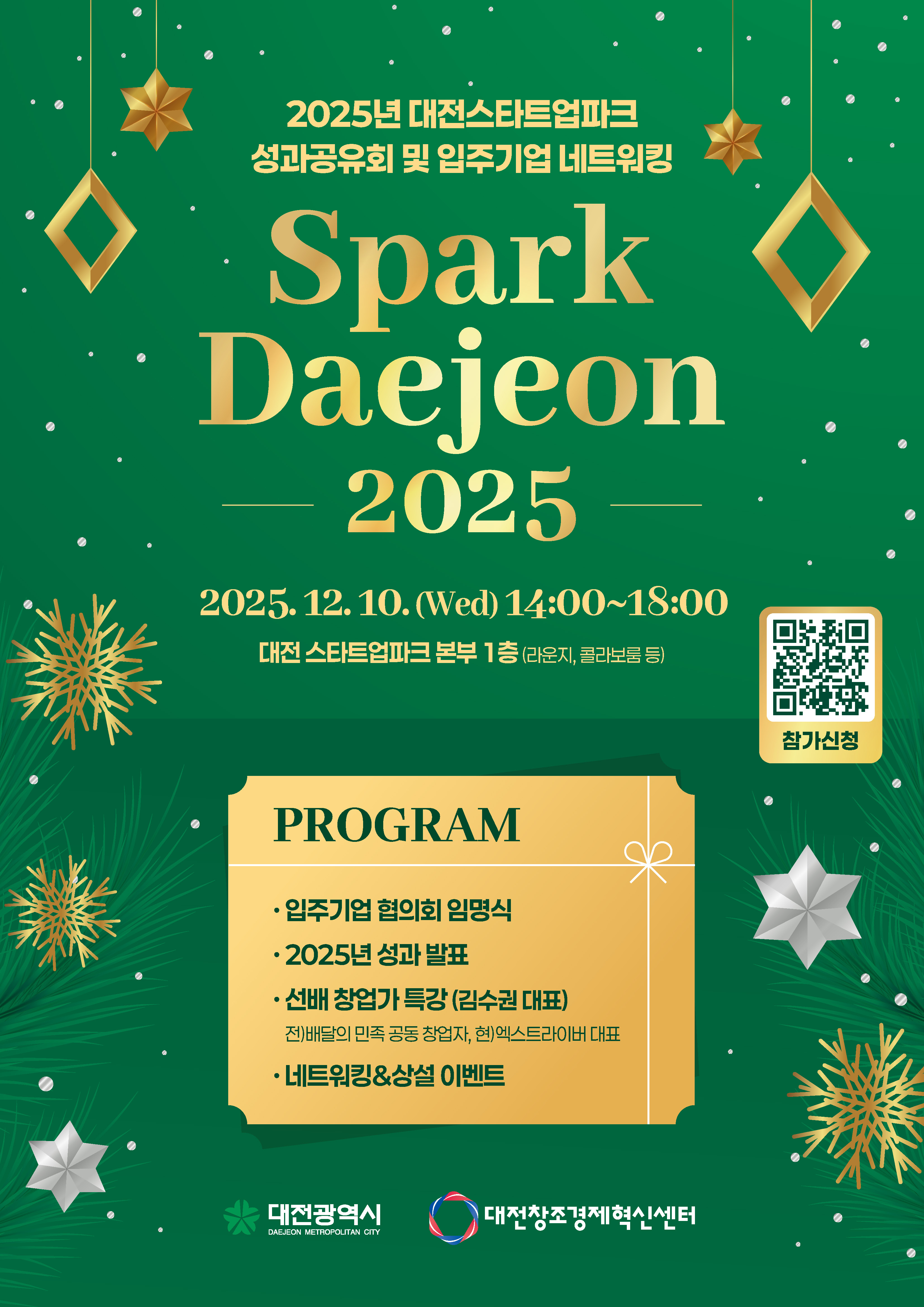 대전 스타트업파크 입주기업들의 성과를 공유하고, 미래를 이끌어갈 창업가들과 교류할 수 있는 'Spark Daejeon 2025'를 아래와 같이 모집합니다. 배달의 민족 공동 창업자 김수권 대표의 특별 강연, 네트워킹 및 다양한 사전 이벤트가 준비되어 있습니다.