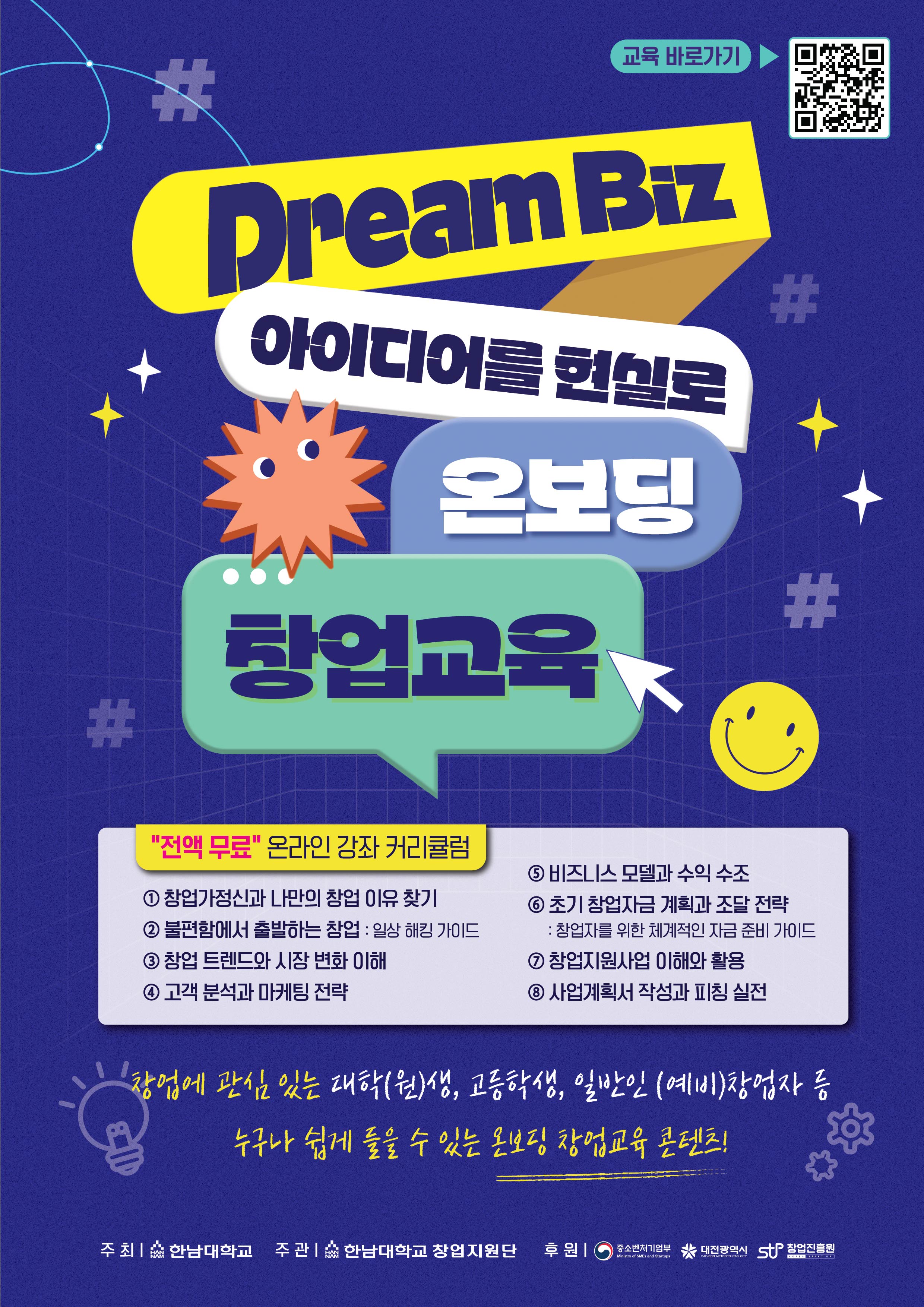 한남대학교 창업지원단에서는 창업에 관심있는 고등학교 학생 및 대학(원)생을 대상으로 기업가 정신을함양하고, 청년 창업 역량을 강화하고자 Dream Biz 프로그램을 운영하고 있습니다.